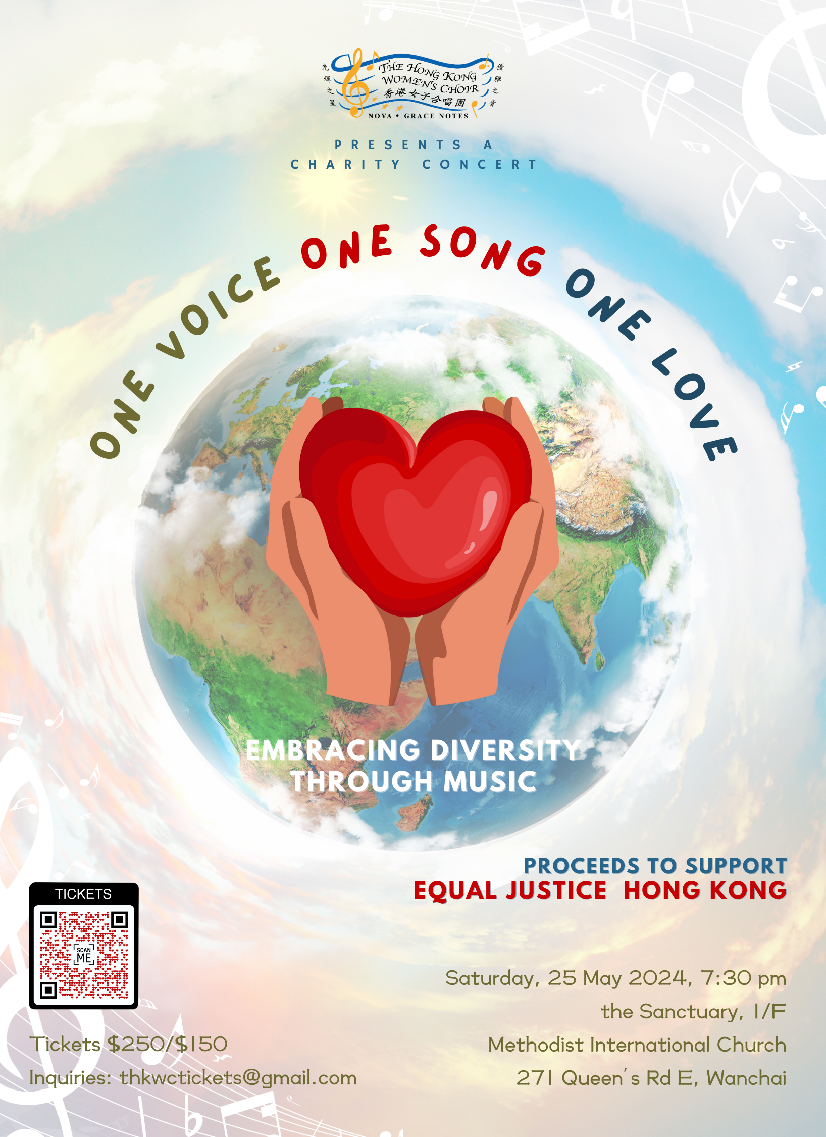 We are thrilled to announce that The Hong Kong Women’s Choir will be supporting EQUAL JUSTICE HONG KONG through the donation of our net proceeds from March 2024 to March 2025! Come join us at our upcoming concert on May 25, 2024, at 7:30 pm, at Methodist International Church for an evening of music celebrating cultural diversity, peace, and harmony!